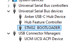 When updating the bootloader, the IMX-5 will switch into ROM bootloader mode and communicate using DFU protocol over USB. In this mode the device is identified in the Window Device Manager as STM32 BOOTLOADER. This device will only appear in the Device Manager when the IMX-5 is in ROM bootloader mode and connected via USB. This device will not appear in the Device Manager during normal operation or when not connected over USB.
